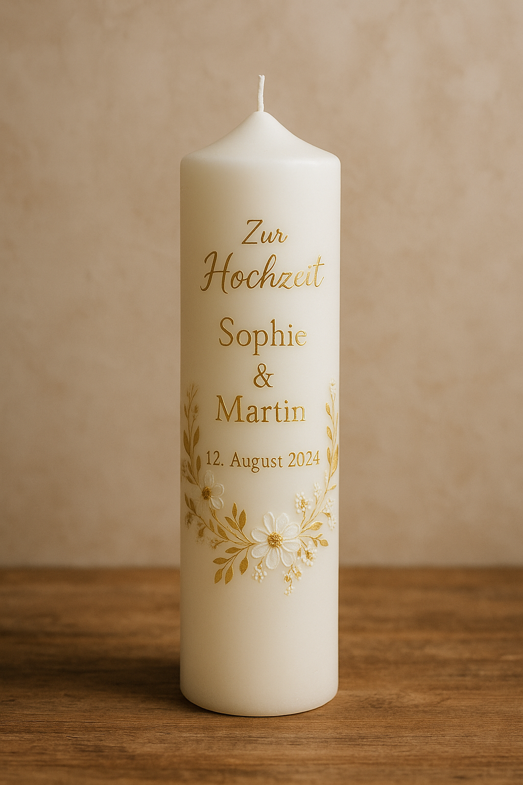 Unsere Hochzeitskerzen werden aus hochwertigen, natürlichen Materialien gefertigt und überzeugen durch ihre ästhetische Verarbeitung und ihre sanfte, harmonische Ausstrahlung. Zarte Blumenmotive, elegante Gold- oder Silberelemente und feine Gravuren verleihen jeder Kerze eine besondere Note. Namen, Hochzeitsdatum oder ein persönlicher Spruch können kunstvoll eingearbeitet werden, um die Kerze zu einem bleibenden Symbol eurer Liebe zu machen.